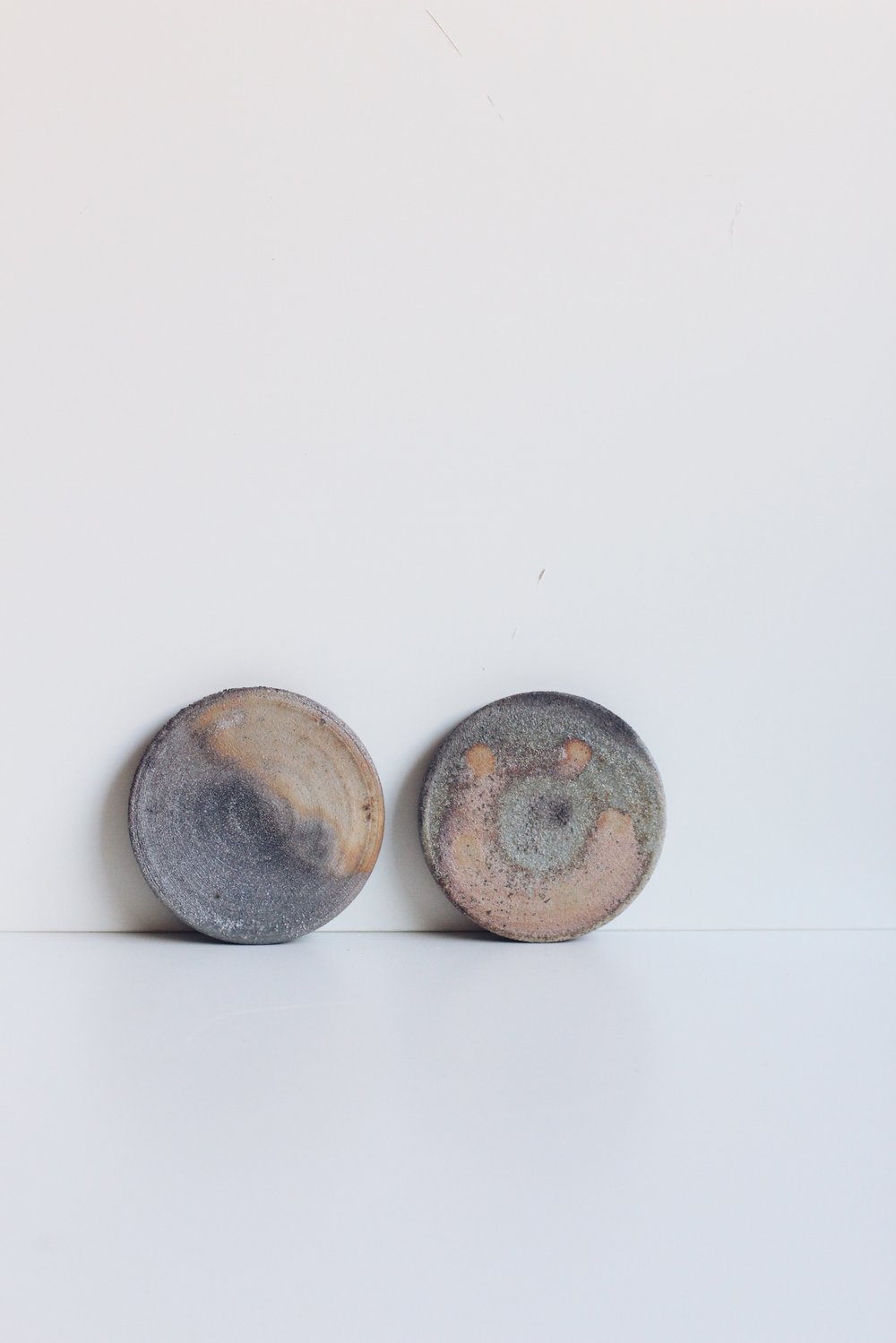Chunky clay discs woodfired at Oxford University Kilns for 5 days. Ash deposits. Carbon trapping. Hang them on a nail and enjoy the depth of their beauty, use them as trivets in the kitchen or as soap dishes if you dare. Get a few and display them together on a wall or shelf, that's what I would do.